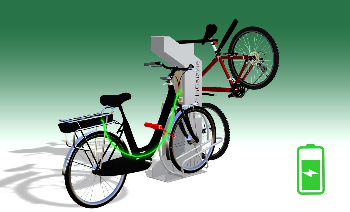 - Un boitier dans lequel placé en sécurité le chargeur de batterie afin de le relier à une prise électrique étanche IP55. Le chargeur est relié à la batterie restée sur le vélo électrique grâce à un système de passe-câble.